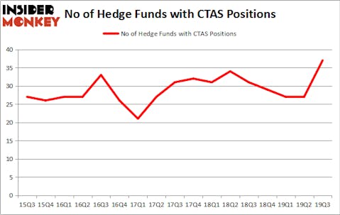 Cintas Corporation (NASDAQ:CTAS) has seen an increase in hedge fund sentiment of late. CTAS was in 37 hedge funds’ portfolios at the end of September. There were 27 hedge funds in our database with CTAS holdings at the end of the previous quarter. Our calculations also showed that CTAS isn’t among the 30 most popular stocks among hedge funds (click for Q3 rankings and see the video at the end of this article for Q2 rankings).
