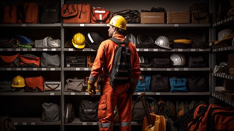 A worker in safety gear and an organized shelf of tools and woven storage bags.