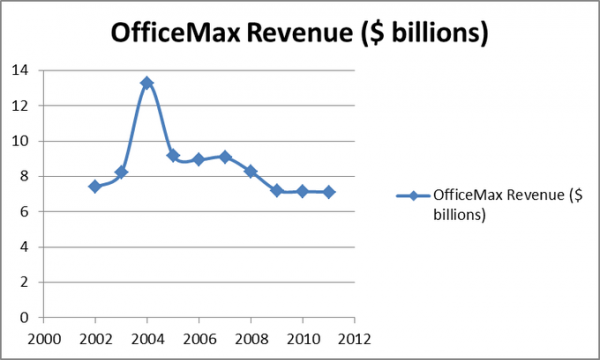OfficeMax Incorporated (NYSE:OMX) is one of the largest distributors of office products in the world, with almost 1,000 superstores. However, the company’s revenues have been declining for some time now (see below) and as a result, shares have performed poorly. This company that traded for over $55 per share just over five years ago is now just over $10. Will the downtrend continue? Should investors who have held strong continue to do so? With the company set to report 2012’s results on Thursday the 21st, maybe we’ll get some insight into the direction of this retailer.