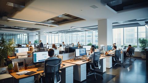 An open concept office space with workers smiling and their faces glowing from computer screens.
