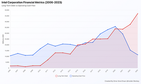This poor performance wasn’t confined to just Q3. If you zoom out, the debt and the cash flow trends are very bearish. It will likely continue to be this way as Intel spends more on catching up.