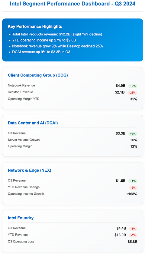 Intel’s business is structured around two main pillars: Intel Products and Intel Foundry. They also own Altera, Mobileye, and some other companies. Here’s a quick glance into how they performed in Q3:
