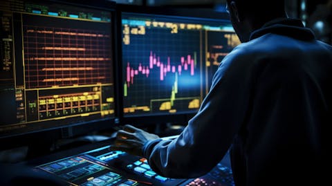 An experienced day trader at a modern trading workstation, looking intently at changing stock prices and reviewing portfolios.