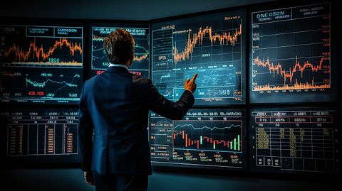A portfolio manager confidently pointing to a graph of market indices on a wall display.