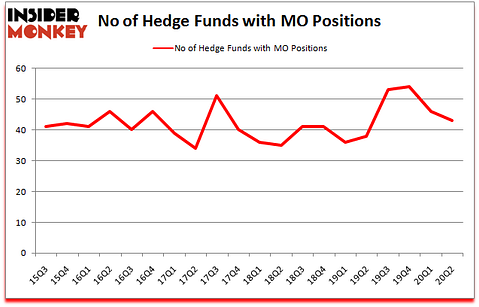 Altria Group Inc (NYSE:MO) has experienced a decrease in hedge fund interest in recent months. Altria Group Inc (NYSE:MO) was in 43 hedge funds’ portfolios at the end of the second quarter of 2020. The all time high for this statistics is 54. Our calculations also showed that MO isn’t among the 30 most popular stocks among hedge funds (click for Q2 rankings and see the video for a quick look at the top 5 stocks).