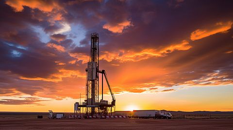 A drilling rig on a remote oilfield, its tower silhouetted against a setting sunset.
