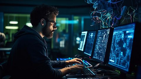 Highlighting the company’s sector and industry, a technician working on a complex SaaS in a technology lab.