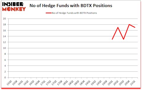 Heading into the second quarter of 2021, a total of 17 of the hedge funds tracked by Insider Monkey held long positions in this stock, a change of -6% from the fourth quarter of 2020. The graph below displays the number of hedge funds with bullish position in BDTX over the last 23 quarters. So, let’s check out which hedge funds were among the top holders of the stock and which hedge funds were making big moves.