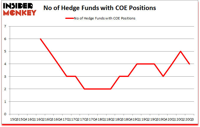 At Q3’s end, a total of 4 of the hedge funds tracked by Insider Monkey held long positions in this stock, a change of -20% from the previous quarter. On the other hand, there were a total of 4 hedge funds with a bullish position in COE a year ago. With the smart money’s capital changing hands, there exists an “upper tier” of noteworthy hedge fund managers who were increasing their holdings significantly (or already accumulated large positions).