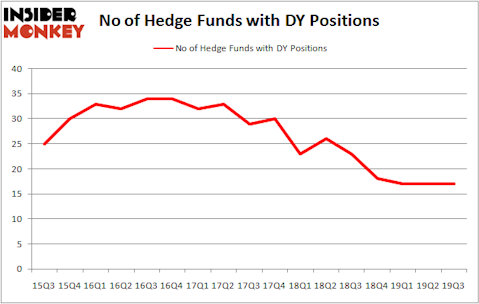 At the end of the third quarter, a total of 17 of the hedge funds tracked by Insider Monkey were bullish on this stock, a change of 0% from the previous quarter. By comparison, 23 hedge funds held shares or bullish call options in DY a year ago. So, let’s find out which hedge funds were among the top holders of the stock and which hedge funds were making big moves.
