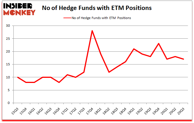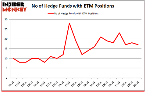 Heading into the fourth quarter of 2020, a total of 17 of the hedge funds tracked by Insider Monkey held long positions in this stock, a change of -6% from one quarter earlier. On the other hand, there were a total of 18 hedge funds with a bullish position in ETM a year ago. With hedgies’ sentiment swirling, there exists an “upper tier” of noteworthy hedge fund managers who were adding to their stakes meaningfully (or already accumulated large positions).