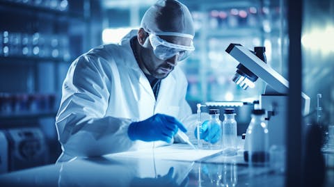 A medical scientist in a laboratory, hard at work creating a new drug for autoimmune diseases.