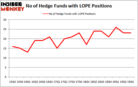 At the end of the third quarter, a total of 23 of the hedge funds tracked by Insider Monkey held long positions in this stock, a change of 0% from the previous quarter. By comparison, 24 hedge funds held shares or bullish call options in LOPE a year ago. So, let’s find out which hedge funds were among the top holders of the stock and which hedge funds were making big moves.