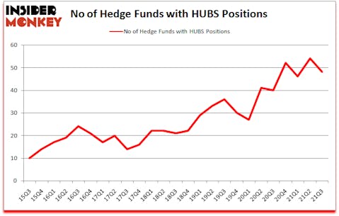 Heading into the fourth quarter of 2021, a total of 48 of the hedge funds tracked by Insider Monkey were bullish on this stock, a change of -11% from one quarter earlier. Below, you can check out the change in hedge fund sentiment towards HUBS over the last 25 quarters. So, let’s examine which hedge funds were among the top holders of the stock and which hedge funds were making big moves.