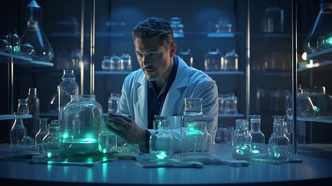 A biochemist in a lab coat surrounded by medical vials and devices used in the development of a biopharmaceutical.