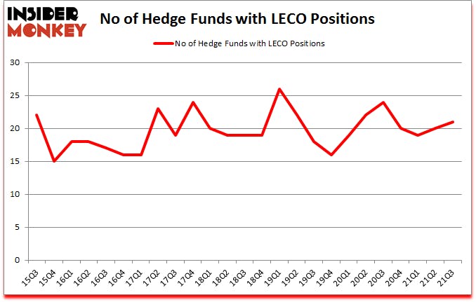At Q3’s end, a total of 21 of the hedge funds tracked by Insider Monkey held long positions in this stock, a change of 5% from the second quarter of 2021. By comparison, 24 hedge funds held shares or bullish call options in LECO a year ago. With hedgies’ capital changing hands, there exists a select group of notable hedge fund managers who were upping their stakes meaningfully (or already accumulated large positions).