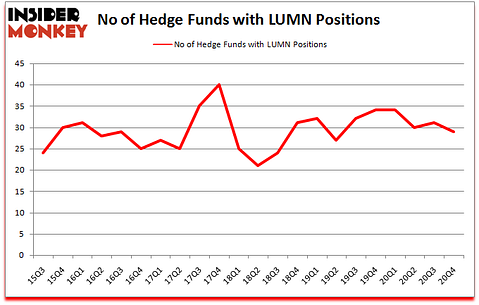 Is LUMN stock a buy? Hedge funds were selling. The number of bullish hedge fund positions went down by 2 lately. Lumen Technologies, Inc. (NYSE:LUMN) was in 29 hedge funds’ portfolios at the end of December. The all time high for this statistic is 40. Our calculations also showed that LUMN isn’t among the 30 most popular stocks among hedge funds (click for Q4 rankings). There were 31 hedge funds in our database with LUMN holdings at the end of September.
