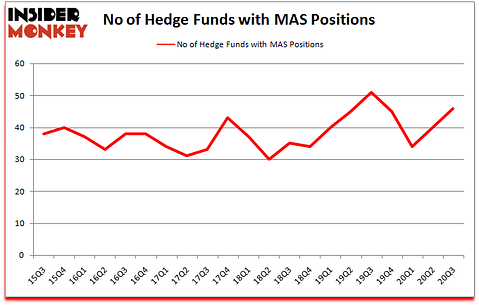Is MAS a good stock to buy now? Masco Corporation (NYSE:MAS) has experienced an increase in activity from the world’s largest hedge funds in recent months. Masco Corporation (NYSE:MAS) was in 46 hedge funds’ portfolios at the end of the third quarter of 2020. The all time high for this statistic is 51. There were 40 hedge funds in our database with MAS positions at the end of the second quarter. Our calculations also showed that MAS isn’t among the 30 most popular stocks among hedge funds (click for Q3 rankings and see the video for a quick look at the top 5 stocks).