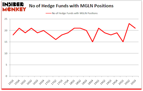 At the end of September, a total of 21 of the hedge funds tracked by Insider Monkey were long this stock, a change of -9% from one quarter earlier. The graph below displays the number of hedge funds with bullish position in MGLN over the last 21 quarters. So, let’s check out which hedge funds were among the top holders of the stock and which hedge funds were making big moves.