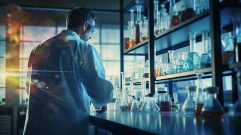 A scientist in a lab coat standing in a research lab examining biopharmaceuticals.