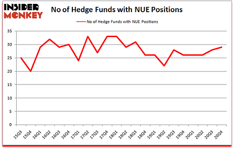 Is NUE stock a buy? Nucor Corporation (NYSE:NUE) was in 29 hedge funds’ portfolios at the end of December. The all time high for this statistic is 33. NUE shareholders have witnessed an increase in hedge fund sentiment of late. There were 28 hedge funds in our database with NUE positions at the end of the third quarter. Our calculations also showed that NUE isn’t among the 30 most popular stocks among hedge funds (click for Q4 rankings).