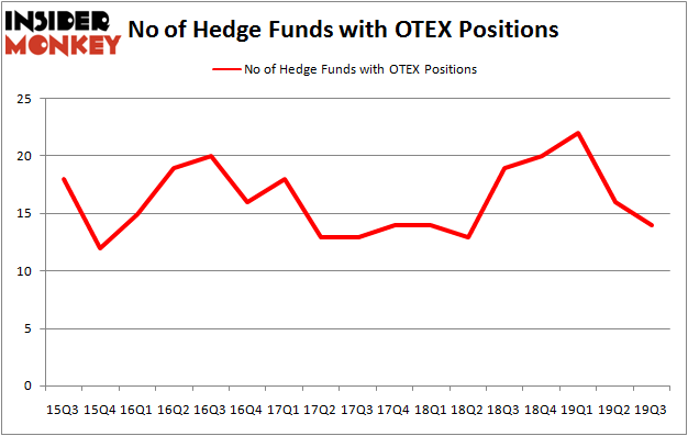 At the end of the third quarter, a total of 14 of the hedge funds tracked by Insider Monkey held long positions in this stock, a change of -13% from the second quarter of 2019. By comparison, 19 hedge funds held shares or bullish call options in OTEX a year ago. With the smart money’s sentiment swirling, there exists an “upper tier” of notable hedge fund managers who were boosting their stakes substantially (or already accumulated large positions).