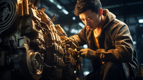 A factory worker examining the inner workings of a complex machinery.