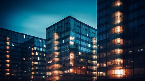 A row of hotel buildings illuminated at night revealing the companies hospitality arm.