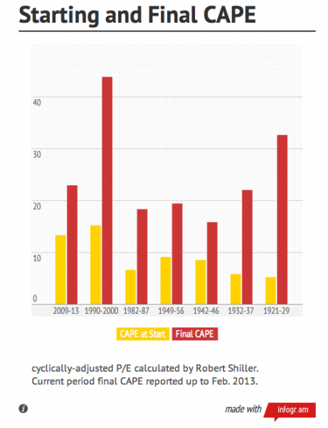 While this bull market has experienced less growth in CAPE than six other periods, it’s still the seventh-greatest CAPE expansion of any bull market in the Dow’s history. However, what may be more important is the actual CAPE that a bull market starts with, versus its final valuation before a reversal.