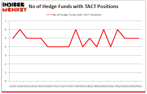 At the end of the first quarter, a total of 5 of the hedge funds tracked by Insider Monkey held long positions in this stock, a change of 0% from the fourth quarter of 2019. By comparison, 4 hedge funds held shares or bullish call options in TACT a year ago. With hedge funds’ capital changing hands, there exists a select group of notable hedge fund managers who were adding to their stakes meaningfully (or already accumulated large positions).