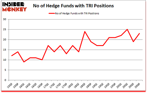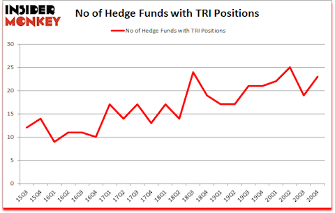 Heading into the first quarter of 2021, a total of 23 of the hedge funds tracked by Insider Monkey held long positions in this stock, a change of 21% from one quarter earlier. The graph below displays the number of hedge funds with bullish position in TRI over the last 22 quarters. So, let’s find out which hedge funds were among the top holders of the stock and which hedge funds were making big moves.