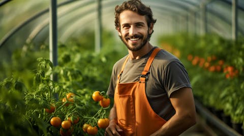 A farmer in overalls happily harvesting vegetables in a lush greenhouse.