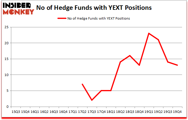 Is Yext, Inc. (NYSE:YEXT) a superb investment now? Money managers are becoming less hopeful. The number of bullish hedge fund positions went down by 1 recently. Our calculations also showed that YEXT isn’t among the 30 most popular stocks among hedge funds (click for Q4 rankings and see the video at the end of this article for Q3 rankings). YEXT was in 13 hedge funds’ portfolios at the end of the fourth quarter of 2019. There were 14 hedge funds in our database with YEXT positions at the end of the previous quarter.