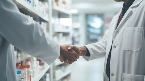 A doctor holding a vial of medication related to antiviral treatments in a medical office.