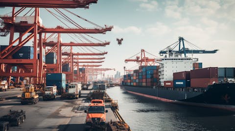 A busy port with a massive cargo ship and a variety of commercial/industrial vehicles.