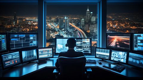 A construction site of a multi-family residential complex, a modern urban skyline in the background.