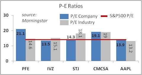 Comcast pays a dividend yield of 2.2% on a payout ratio of 40%. The company’s peers DirecTV (DTV) and Dish Network Corp. (DISH) do not pay regular dividends. In terms of valuation, the company’s P/E is almost on par with that for the industry, but well above the company’s own five-year average ratio. Fund manager Lee Ainslie of Maverick Capital is an investor in the stock.