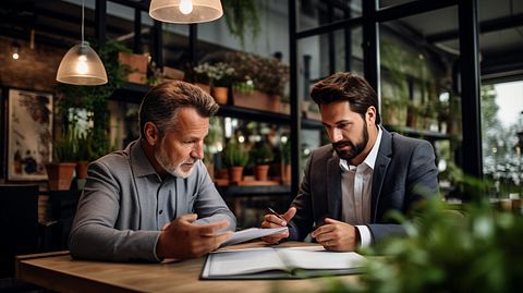 A Professional insurance broker discussing coverage plans with a small business owner.