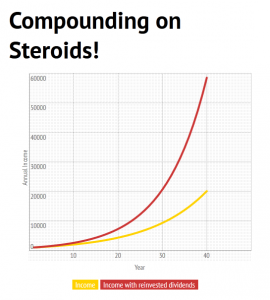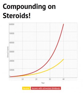 If you don’t reinvest your dividends over 40 years then your income stream grows to about $20,000 annually, all through the magic of compounding. But if you reinvest those dividends each year in equivalent dividend growth stocks, your income stream grows to an astounding $58,500 annually–almost three times as much! Clearly there’s an advantage to dividend growth investing.