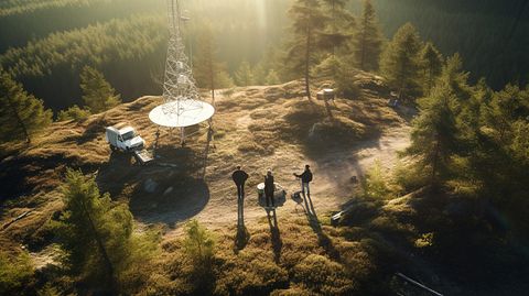 An aerial view of lone workers in the wilderness being tracked by a modern satellite communication system.
