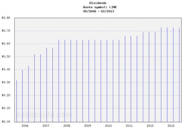 2). Massive Dividend: At the moment, Linn Energy pays out quarterly dividends of $0.73, which when annualized puts the dividend as yielding 7.79%