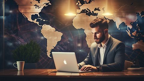 An entrepreneur with a laptop, working away on the lifestyle media platform with a world map in the background.