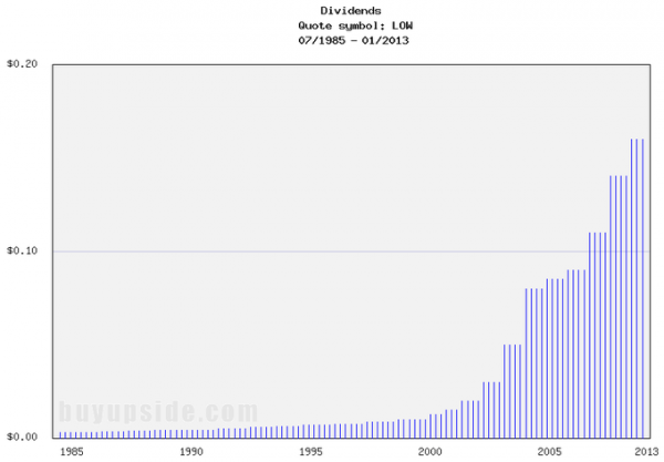 1). Solid Revenue Growth: In 2007, Lowe’s reported revenue of $46.93 billion; in 2012, the company announced revenue of $50.21 billion, representing year over year annual growth of 1.36%, a trend that is anticipated to accelerate into the future with projections placing 2017 revenue at $58.55 billion. This growth has been a result of the economic recovery in the United States and a revival of consumer and homebuilding spending