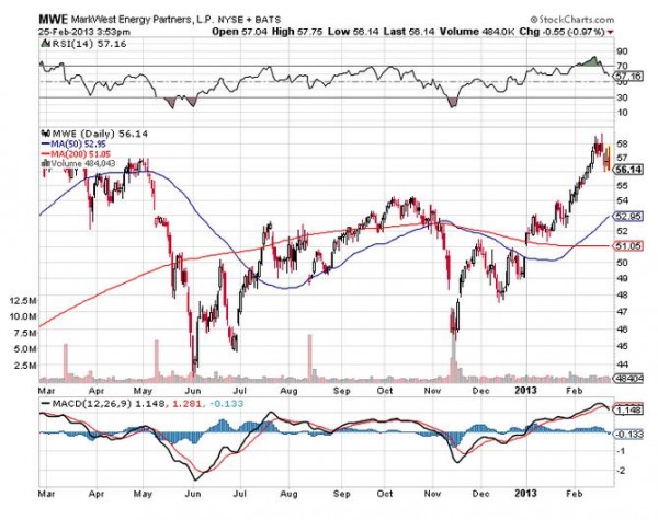 4). Dividend: Currently, Markwest pays out quarterly dividends of $0.82, which when annualized puts the dividend yield at 5.73%, a major advantage for long-term investors