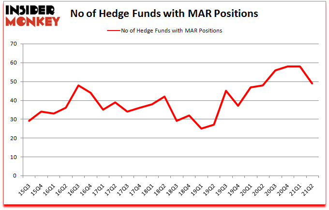 Marriott International Inc (NASDAQ:MAR) investors should be aware of a decrease in hedge fund sentiment of late. Marriott International Inc (NASDAQ:MAR) was in 49 hedge funds’ portfolios at the end of the second quarter of 2021. The all time high for this statistic is 58. There were 58 hedge funds in our database with MAR holdings at the end of March. Our calculations also showed that MAR isn’t among the 30 most popular stocks among hedge funds (click for Q2 rankings).