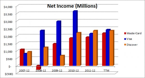 From this chart you can see Visa jumped up ahead of the others early and then slowed as Discover and MasterCard showed strong growth. MasterCard was the only one to have a reported loss through this period.