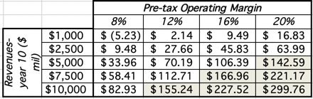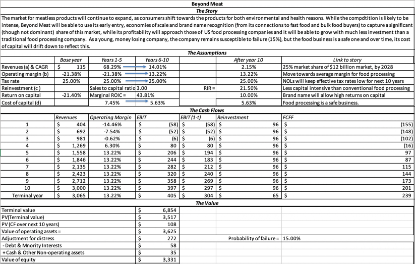 The shaded cells represent break even points, where you could justify buying Beyond Meat at the price ($127) it was trading at on June 11, 2019. Put differently, if your story for the meatless meat market and Beyond Meat’s place in it leads you to revenues of $5 billion or higher with an operating margin of 20%, you should be a value investor in the company.