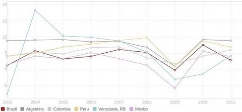However, all of the countries except Colombia and Peru have declined since 2010. Brazil, the largest Latin American economy, posted the sharpest decline, and preliminary forecasts for its 2012 GDP growth see a continuation of the downtrend, down to 1.03% growth.