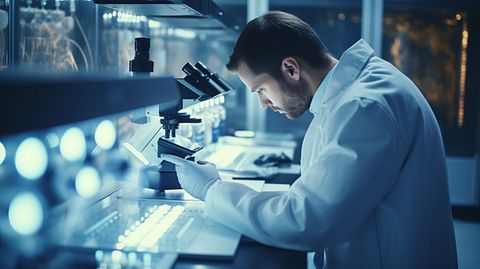 A scientist in a laboratory coat looking into a microscope at human bone regeneration samples.