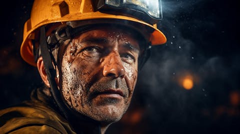 A miner in a hardhat and safety gear toiling in a mine below the surface.